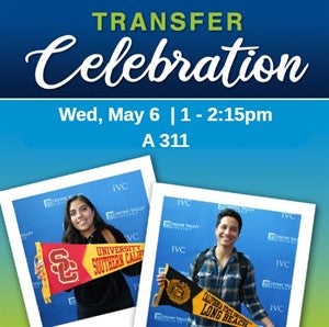 Join us at the Transfer Celebration to celebrate the hard work you have accomplished with IVC administrators, IVC alumni, university representatives and your fellow classmates! Delicious food provided by Fiesta Gourmet. Limited seating available! If interested, please RSVP by May 1.